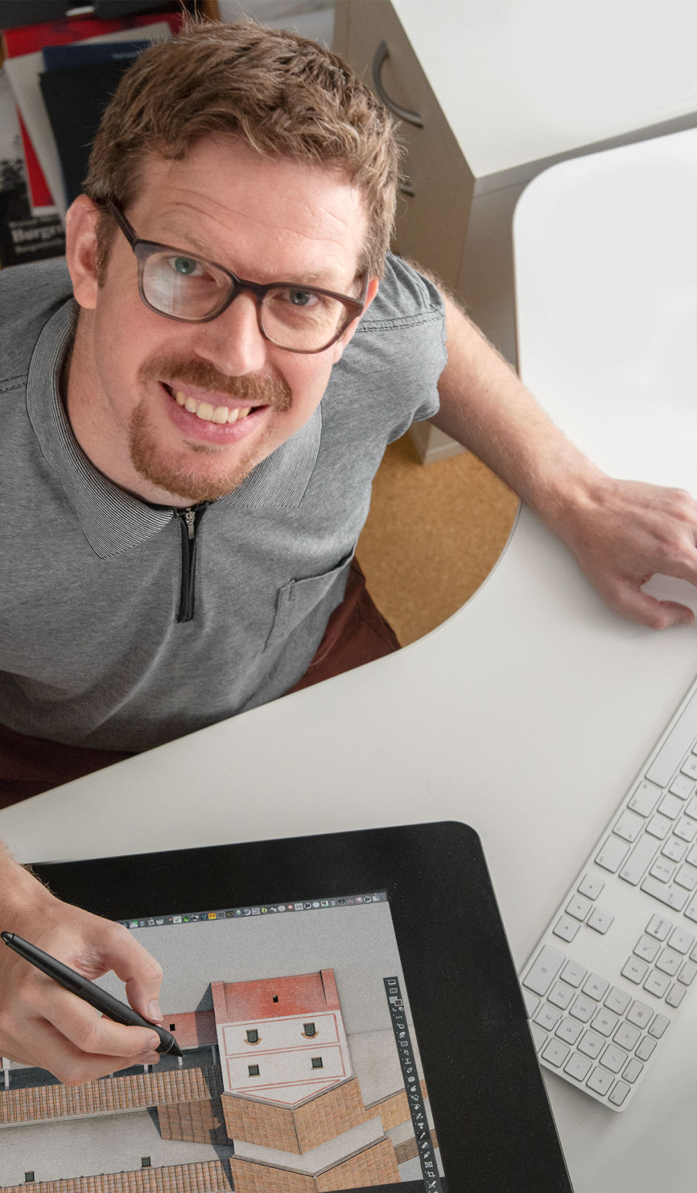 Als freischaffender Illustrator realisiere ich seit fast zwei Jahrzehnten Projekte für Institutionen, Vereine und Privatpersonen. Von Beginn an galt mein besonderes Interesse der Rekonstruktion historischer Gebäude und archäologischer Lebensbilder – eine Spezialisierung, die ich bis heute vertiefen und kontinuierlich ausbauen konnte. Mein Fachwissen erweitere ich laufend durch Bücher, Reisen sowie den Austausch mit Expertinnen und Experten.
