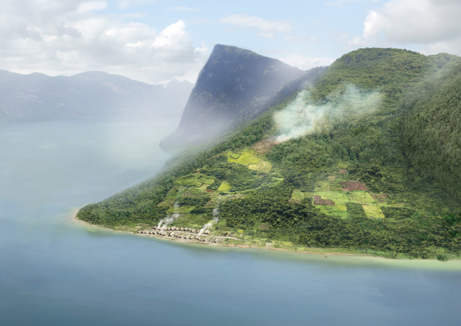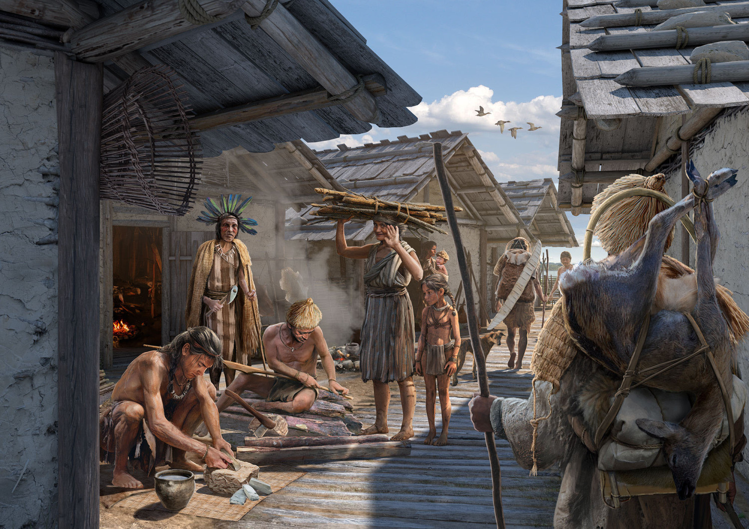 Rekonstruktionsbilder für die Pfahlbausiedlung in Kehrsiten (Jungsteinzeit, 4. Jt. v. Chr.)